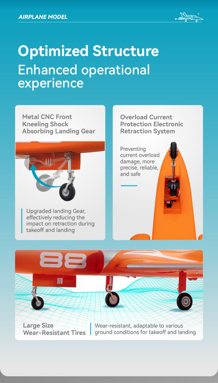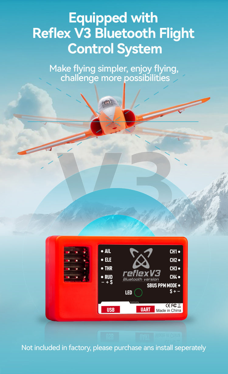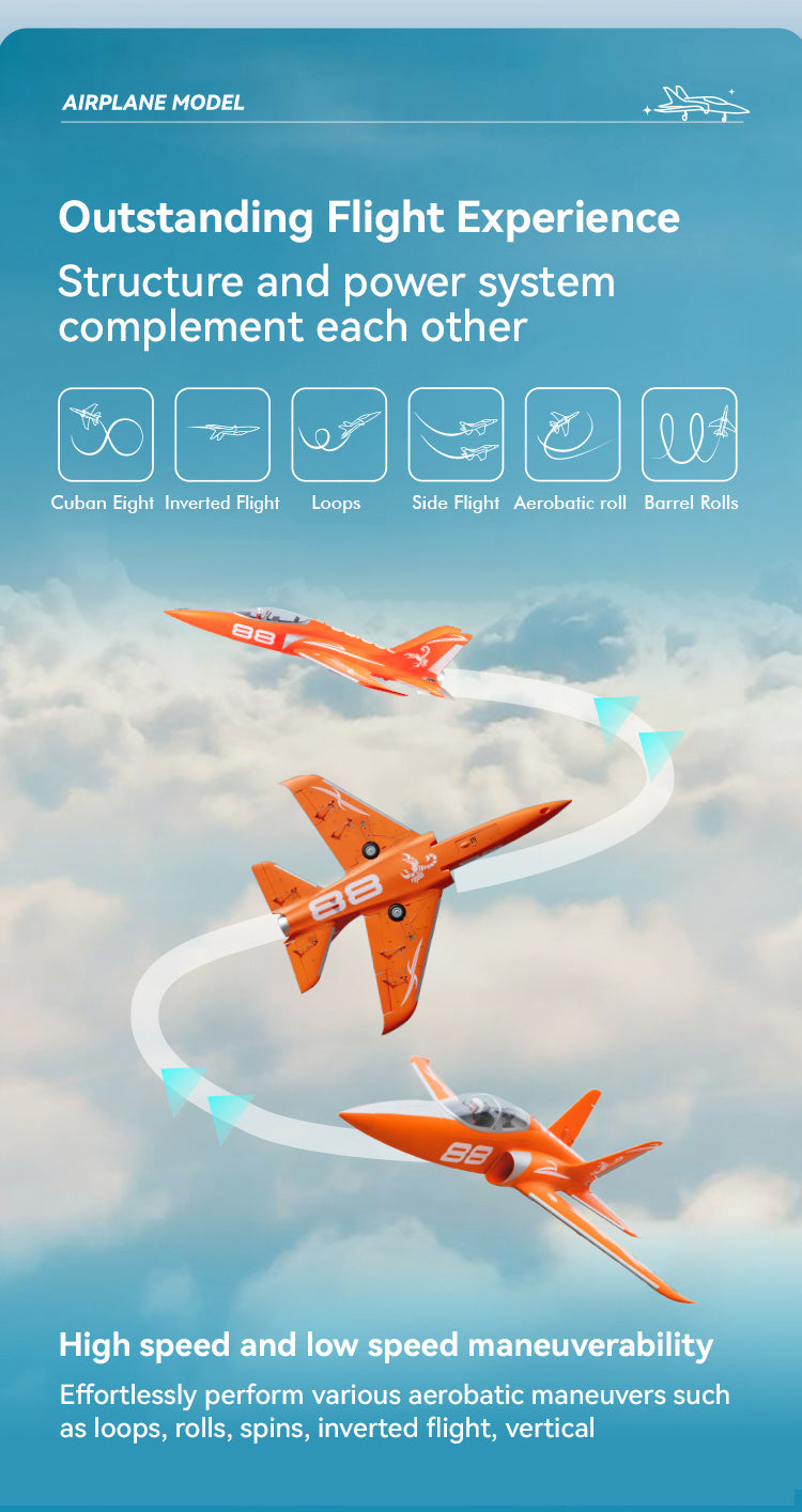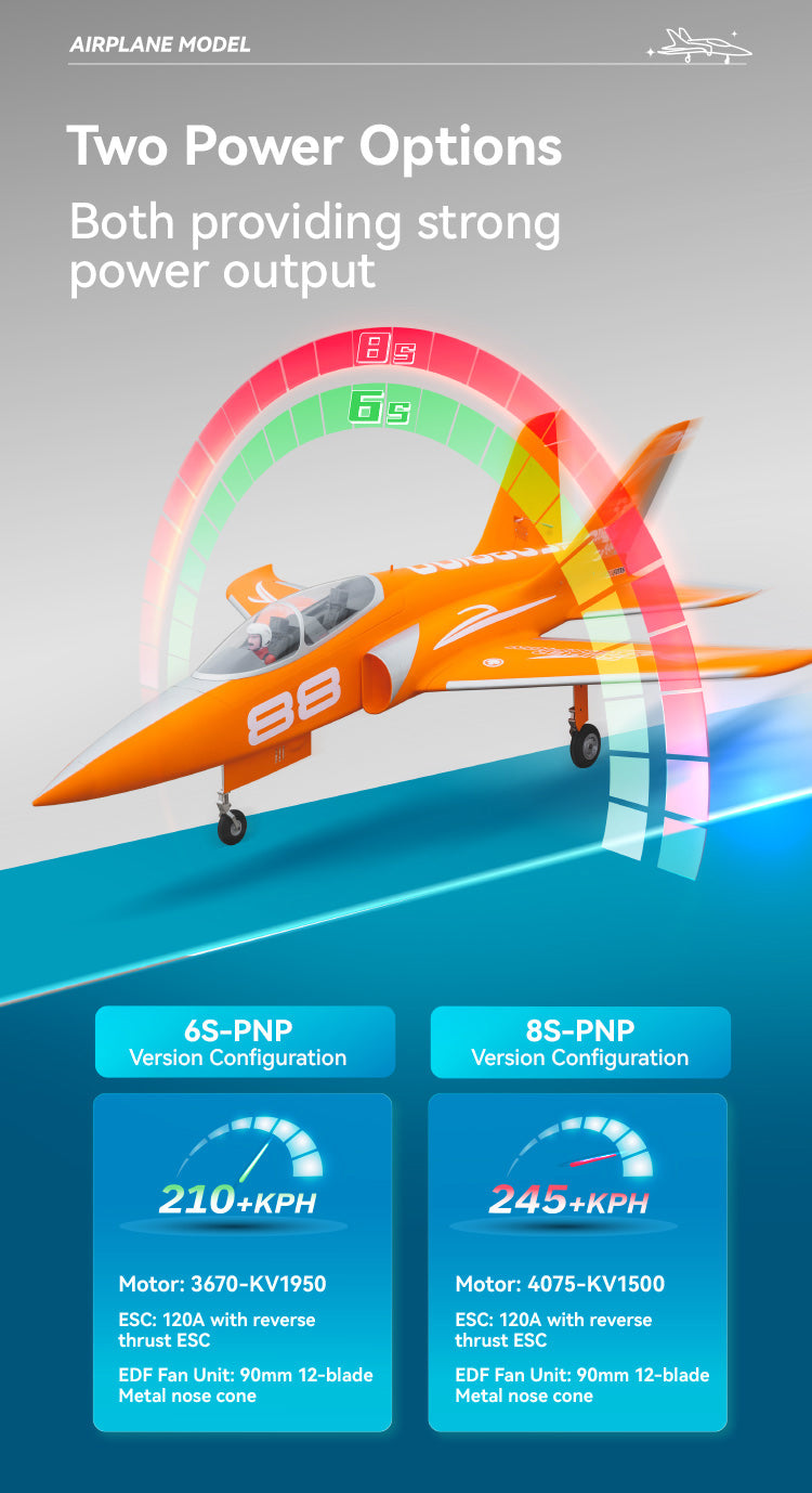 The power system, which provides tremendous thrust and speed, utilizes our new and improved 70mm 12-blade EDF V2, KV1900 motor system. This brawny system, when coupled with a 6S battery, provides a resonating turbine engine sound.