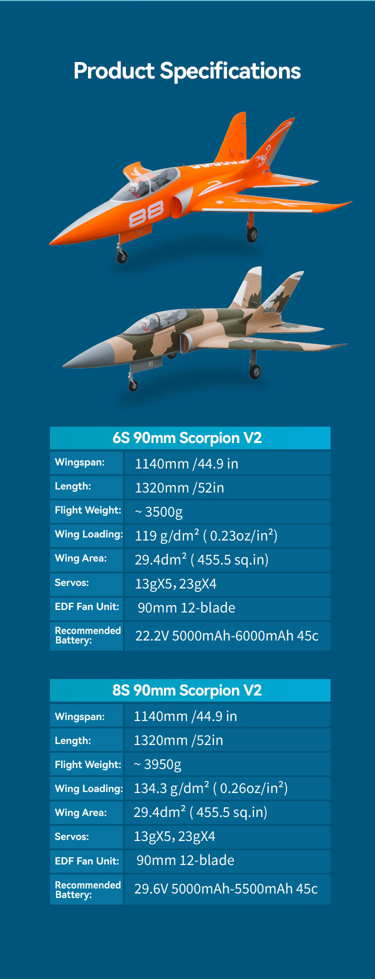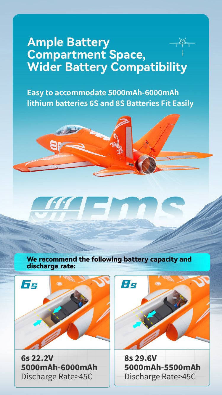 | Recommended Battery | 22.2V 5000mAh-6000mAh 45c with EC5 connector | 29.6V 5000mAh-5500mAh 45c with EC5 connector |