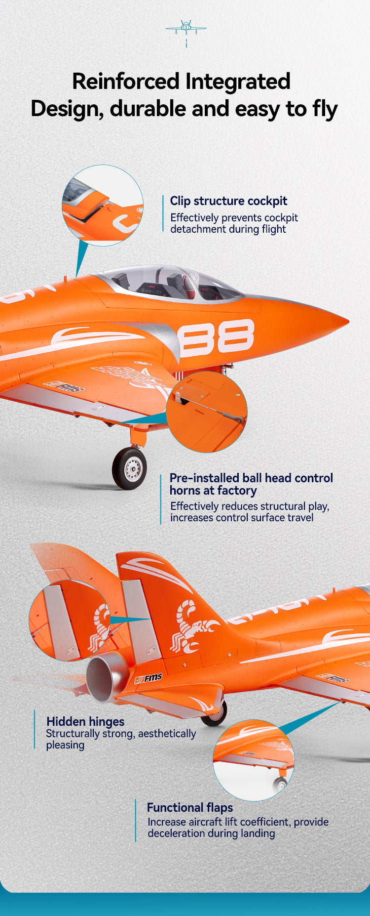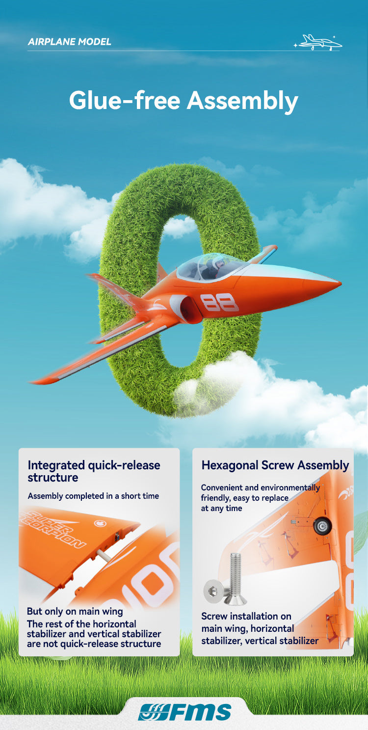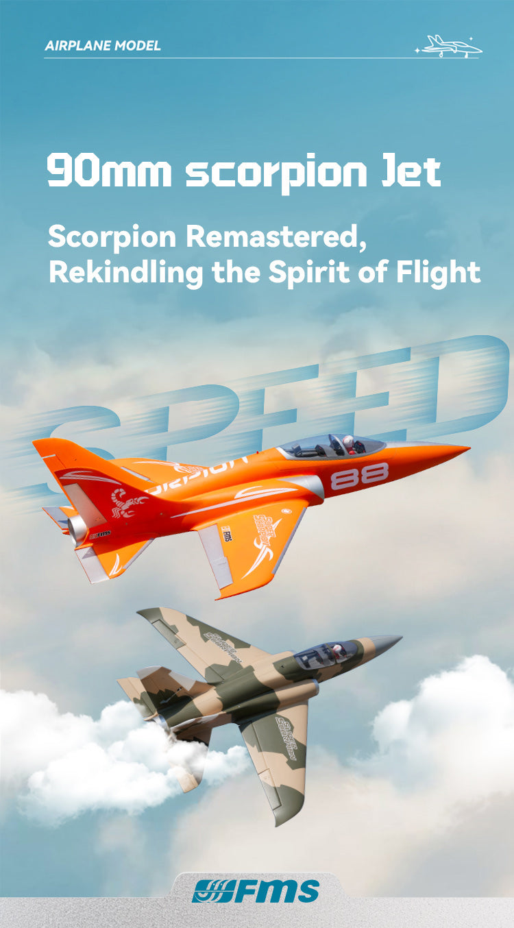 The all-new FMS 90mm EDF Super Scorpion V2 is here. Designed to elevate your flight experience with its upgraded inrunner motor and unique 12-blade fan. You'll feel the power and hear the difference! Choose between striking orange or camouflage paint schemes, both optimized for increased visibility and realism in flight. Available in 6S and 8S versions, this advanced sport jet delivers on every front; speed, stability, and maneuverability. Ready to dominate the skies? The Super Scorpion V2 has arrived!