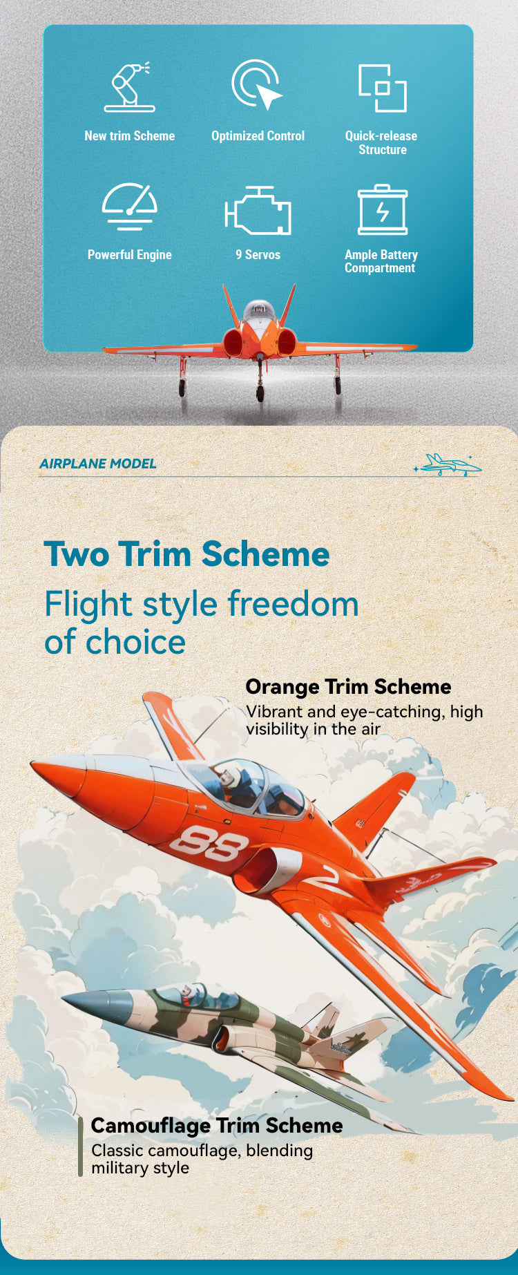 The EPO material ensures the durability. The environmentally friendly water-based paint ensures vibrant and glossy color schemes. The significant input of the basic materials makes this airplane fantastic.